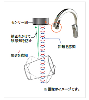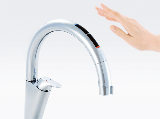 水栓に触れなくてもセンサーに手をかざすだけで吐水/止水ができます。